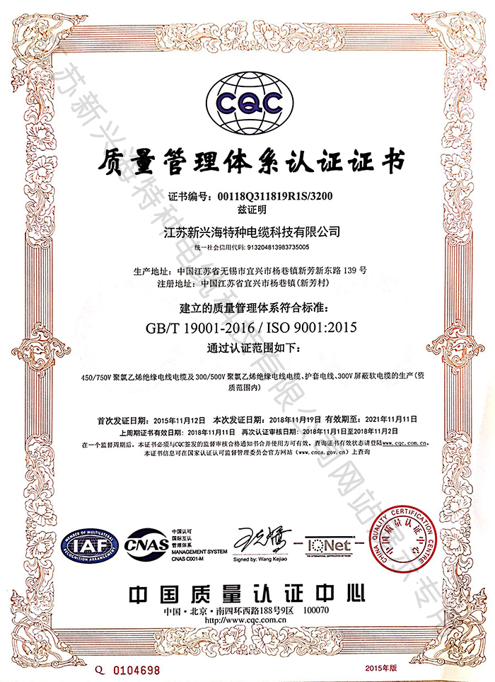 質量體系管理證書-江蘇新興海